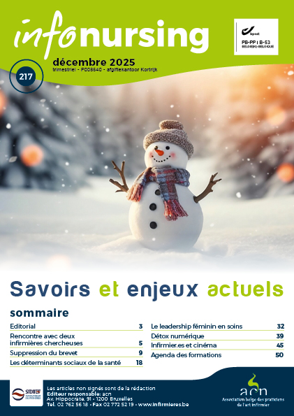 Les membres et structures affiliées de l'acn ont reçu la revue InfoNursing 217 "Savoirs et enjeux actuels". Ils peuvent également la télécharger en format pdf.
